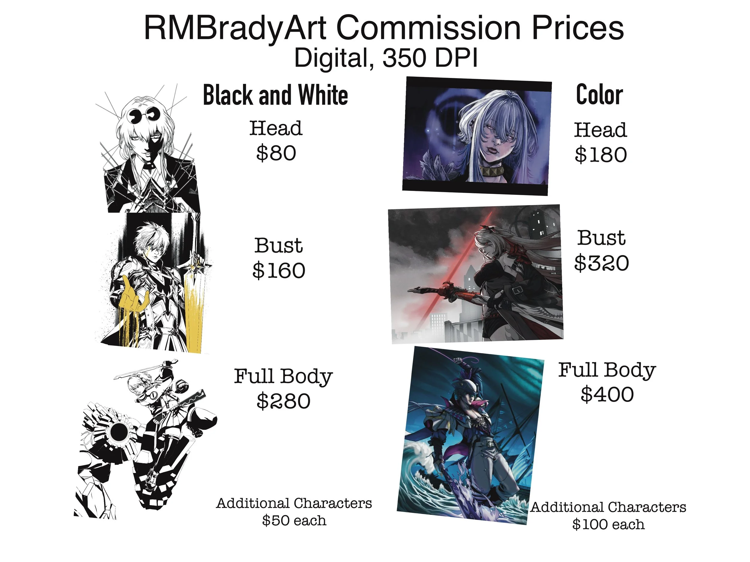 If there are any styles you see me do and post on my social media or portfolio that I don’t have listed on my commission sheet that you are interested in me doing for your piece feel free to contact me so we can work something out to get it done.